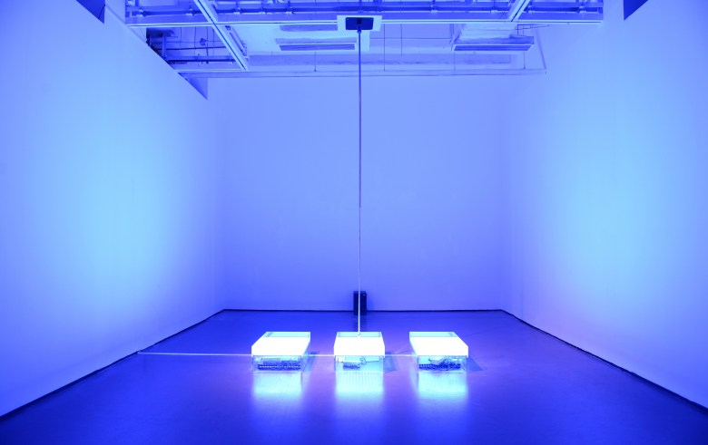 Sensory Overload is an inter-media art installation which used elements from nature. In the piece, there are three elements in the whole system: the propeller as the fan, the water, and the light. The propeller suspended above the middle water cabinet, and the LED panel hidden at the bottom of each water cabinet.