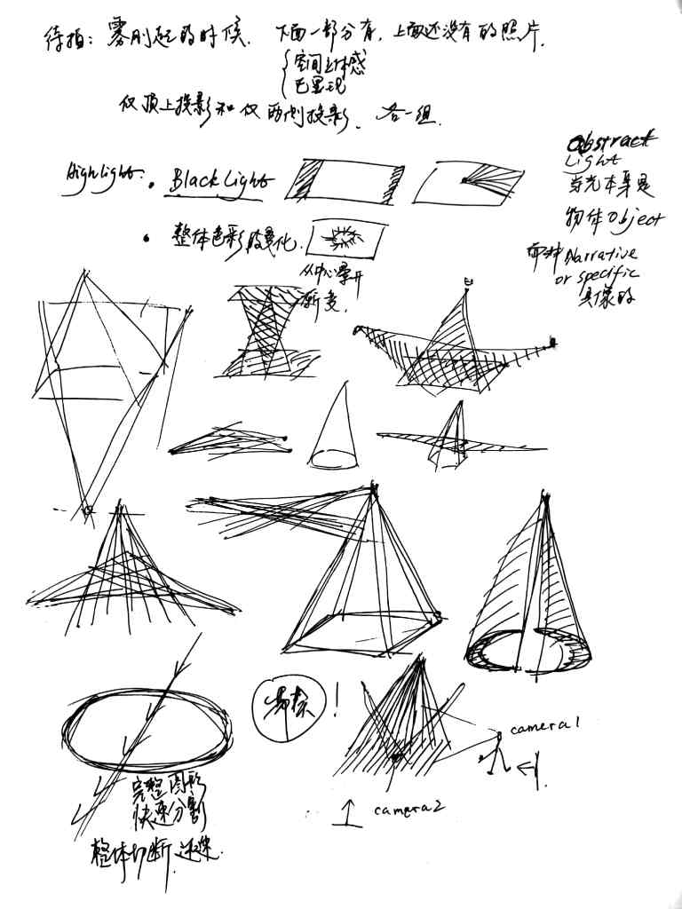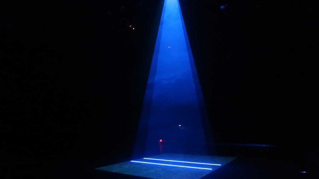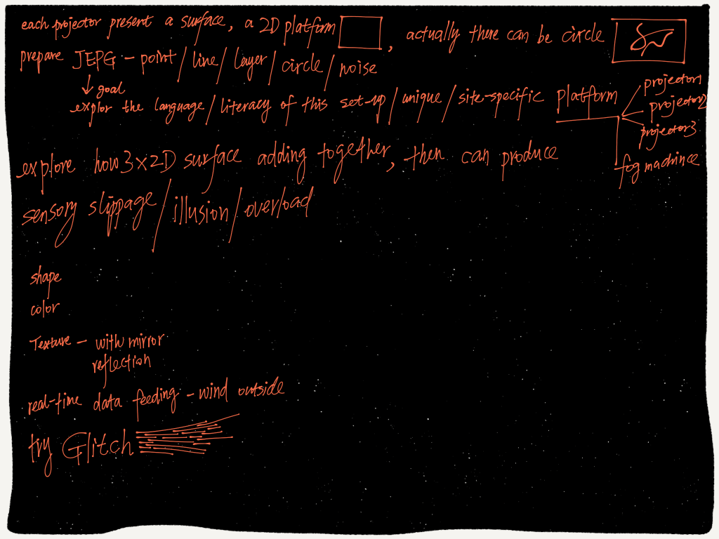 This work was proposed as the final practical project for Professor Kathleen Irwins’ course – THEA810AA Spatiality in Art / Performance. It is an experiment that trying to explore the theme of solipsism and sensory overload. This experimentation is a practice of light, especially the spatiality of the light, explore light and reflection within the theatre environment – a fully black box. The projectors as the light source (instead of the content container), a fog machine producing haze fills the air that enable the shape of the light appearing in the space.