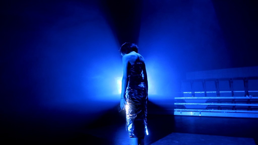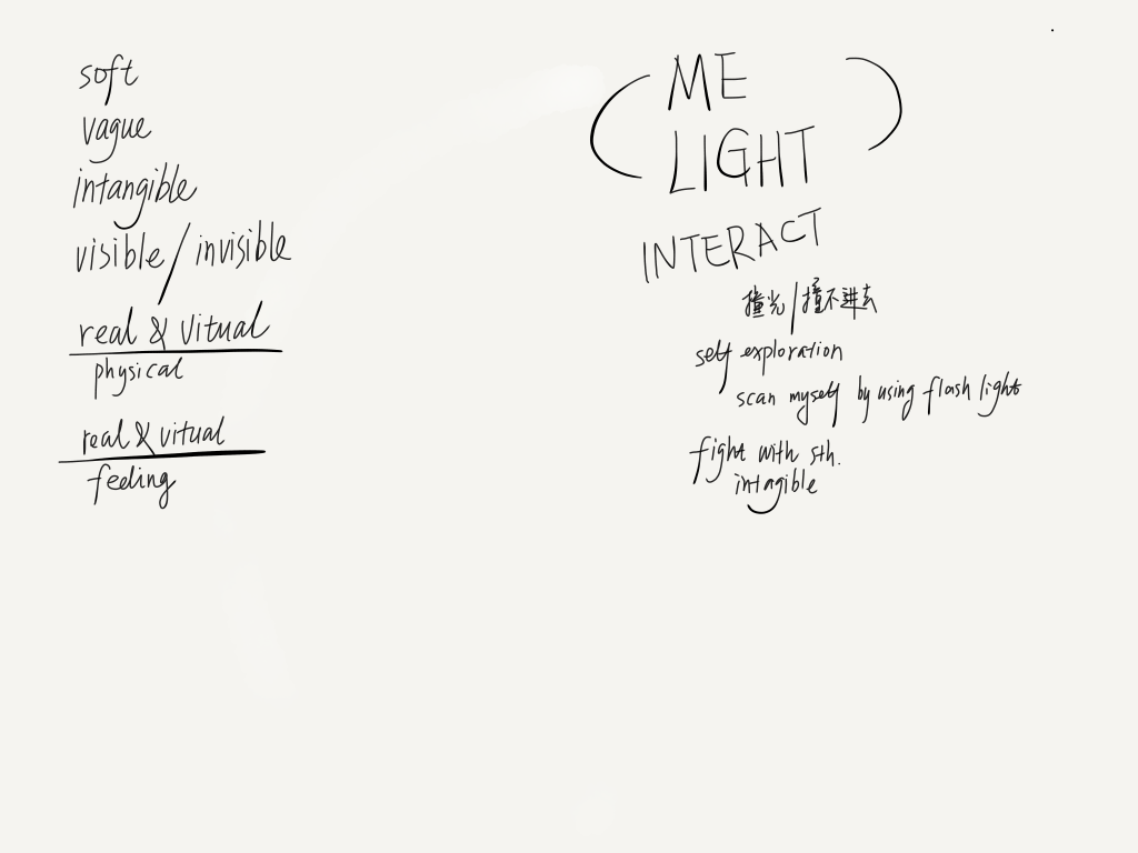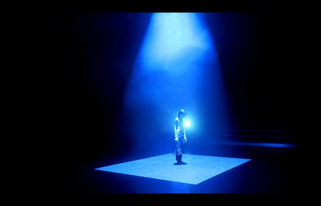 I define this project as a site-specific performance. In this experimentation, the topic I want to explore is still about sensory perception, and I bring my own body into the work which I would never imagine before. I performed with the light comes from the projectors with reflective material is embodied. The light in this work is the main object that has become more tangible than it was in the previous works. It does not attach on any structure or material, it directly comes from the projector in the dark empty space. The projector used to function as a content container to present meaningful message (text/image/video), but in this work, I saw the projector as light source, the light itself – the shape of the light, the color of the light, is the meaning. What it could be when the theatre is not serving for a people-centered performance rather than performed by the MACHINE – the instrument/equipment lives in the site? What is the unexpected/unfamiliar possibility/purpose of those machine in that site? This work is a machine performance at the theatre, a site normally understood as a black box where a human’s imagination of the story, body movements, language interaction, acting/playing/performing can be unlimited expressed and delivered to the audience within a certain context. It is a site, where all kinds of human’s emotion, action, reaction can be automatically legitimization. However, this work explores the circumstances when the machines take in charge – acting/playing/performing. Compare with my previous works, the site(space) in this work also plays a significant role, which connects with the my research methodology: the tension between familiar and unfamiliar. All the instruments (equipments/machines) in that site are “familiar” in any sense, they are living in the site, they used to serve for human performers, but in this work, they are performers, me – as a human, collaborate with the light. We are equal factors in the performance, and even, the light itself has its own personality, it’s unconsciousness presenting as a human-like factor. All of these parts are “unfamiliar” concept of the site/space. The function of the theatre still “familiar”- you come into the black box, with the specific expectation of you are going to experience an artistic performance. But it’s just not in a way that performed by many people around narrative stories or an explicit motif, a complex system to cooperate with each other at a very accurate time as it normal to be.