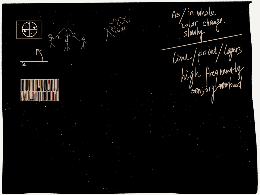 “Unsettling Light” is an ongoing site-specific performance that using three projectors in a theatre space to explore the relationship between light, reflection, space and performer/audience. More specifically, to explore the various quality of light, such as the shape of the light, the spatiality of light or black light (if exists). In some sense, this is an extend project of Sensory Overload, but I bring my own body in the space and the system. I would consider myself as a kind of “Interface” to reacting with the light and sound. The project was done in a visual programming software, and part of the light effects were real-time sound-driven. This project is still under develop.