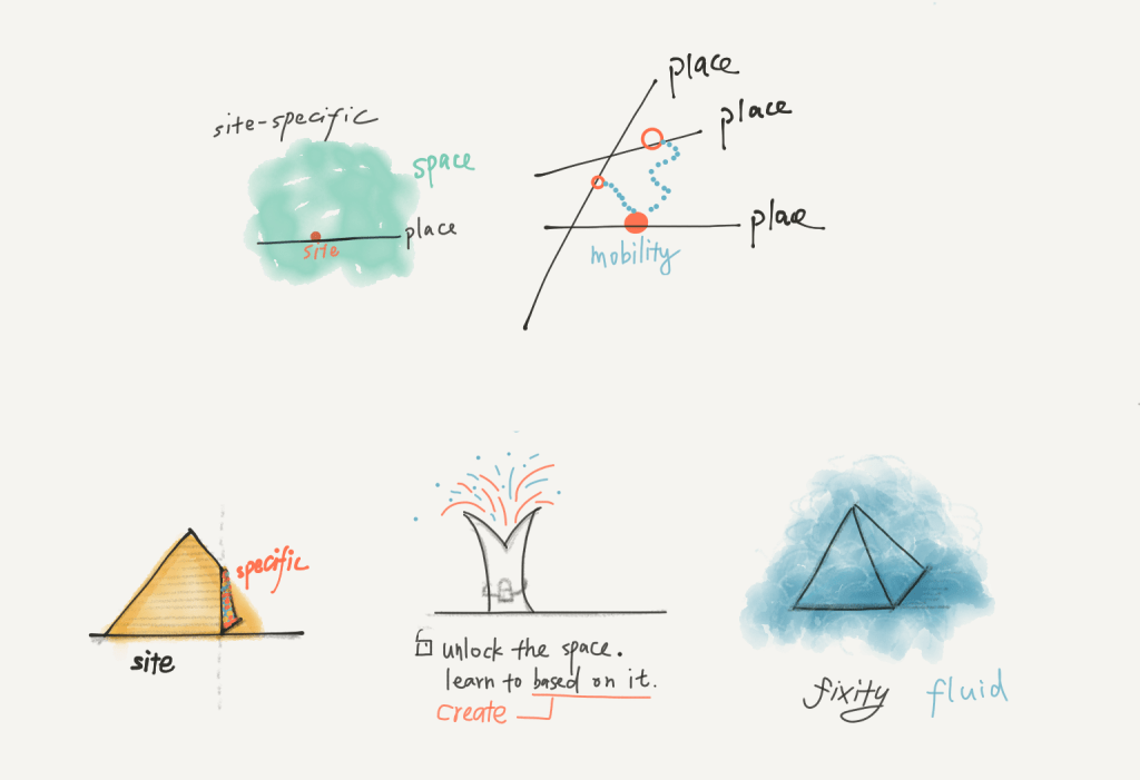 Instances of embodied personal place, physical site, and conceptual ideas/maps/naming of spaces