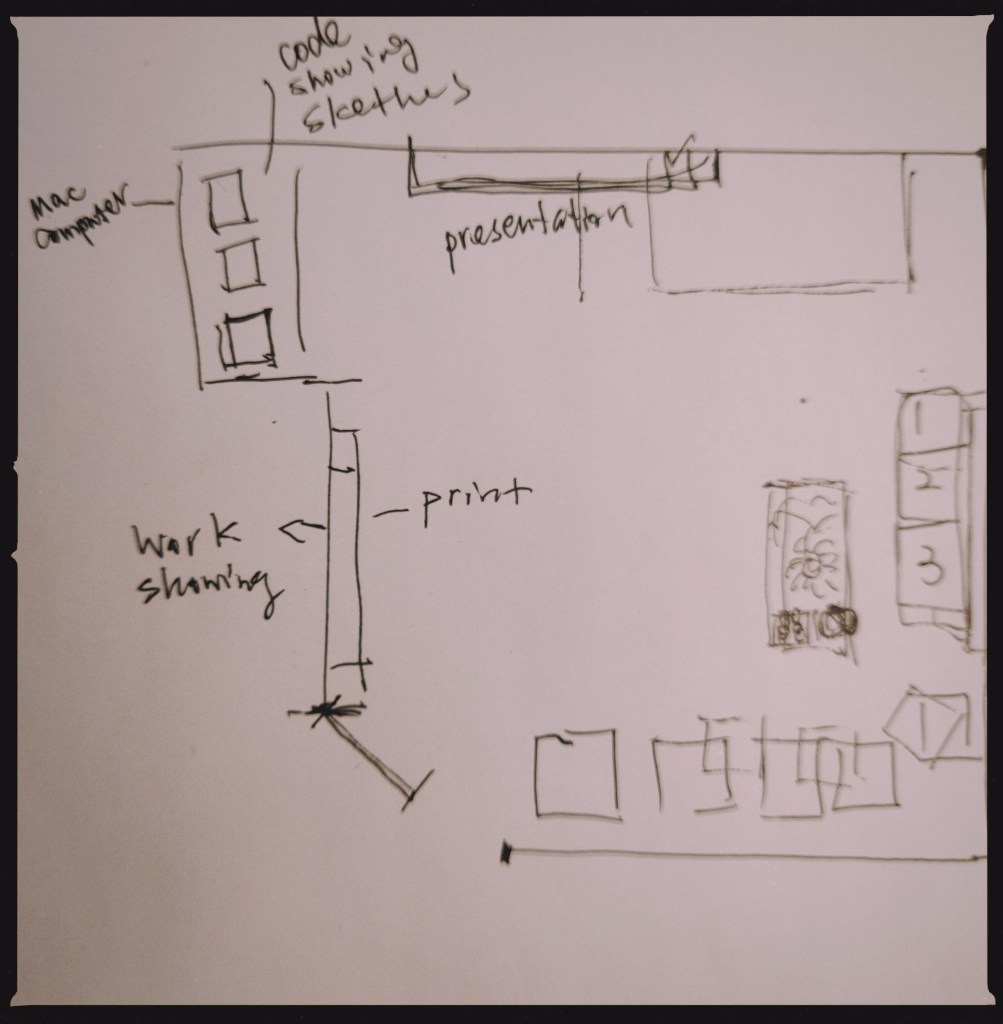 As the review happens in my studio, my goal was turning part of the studio space as an exhibit place, but in the mean time, keep the nature of the studio – a place where I working, learning, and making art. One of the important things I considered during the preparing stage was work with the physical space as much as possible. One of my studio mates who is my neighbour borrowed me her space. I moved the mobility wall that between me and my neighbour to have one larger space so that I can accommodate for 10 seats. After rearranged, the space becomes way more interesting, because it brings a lot potentials of different ways to use the space. I spent some time to move things around to find out the best way of using the space. See the following sketch of my floor plan.