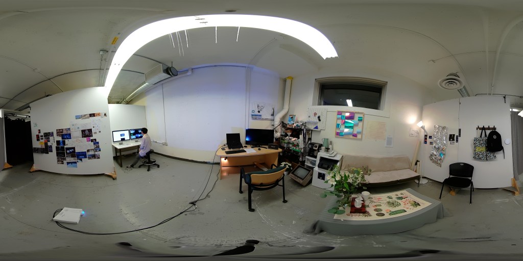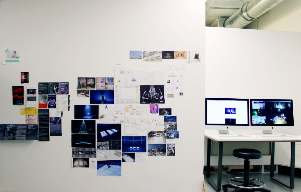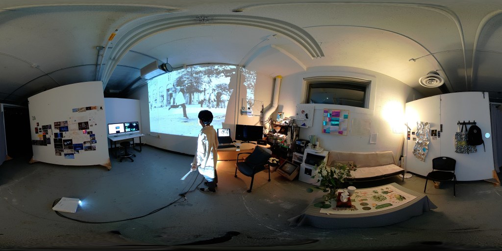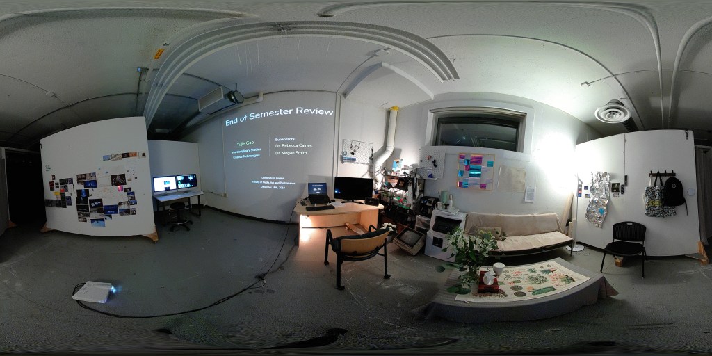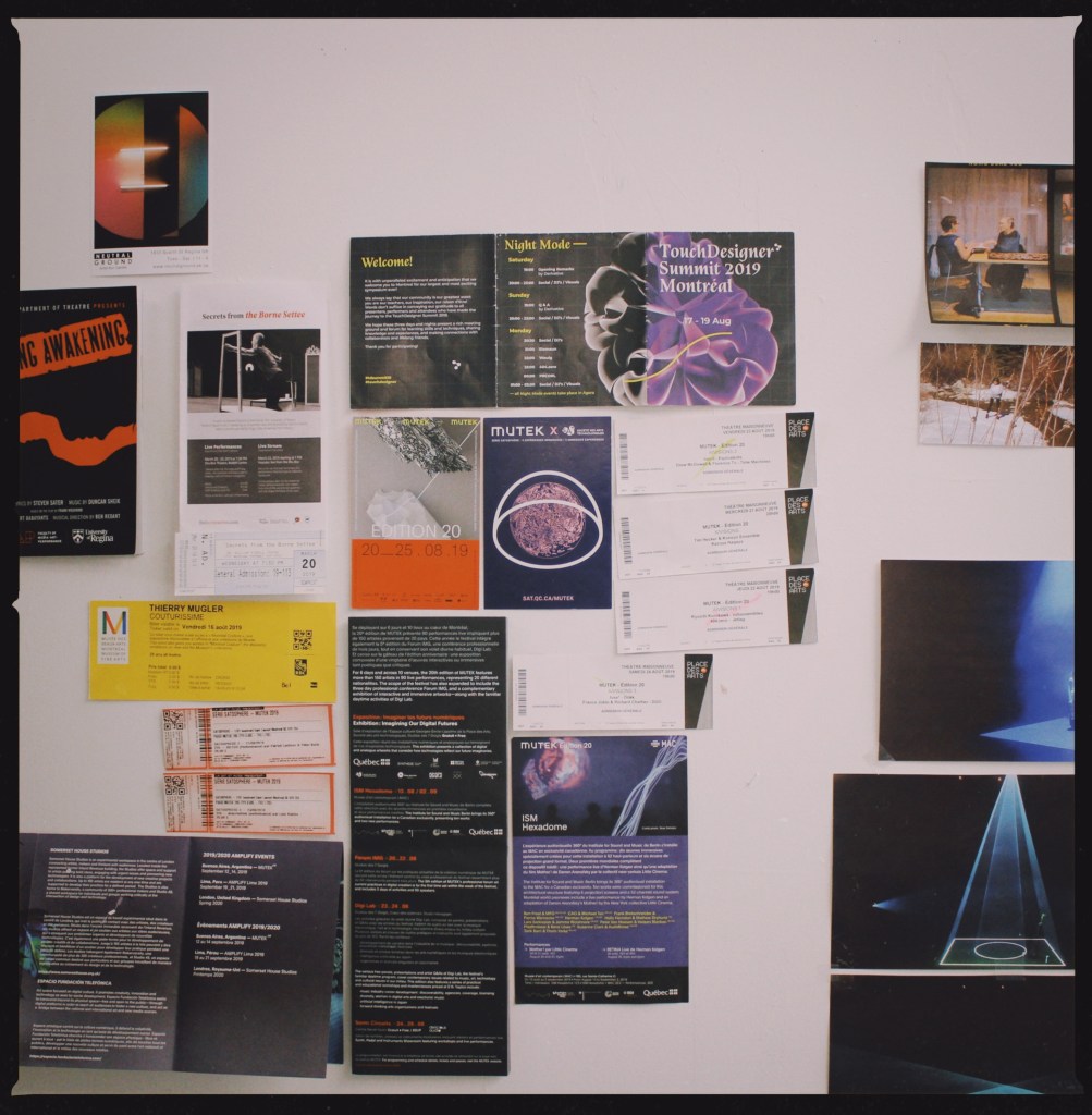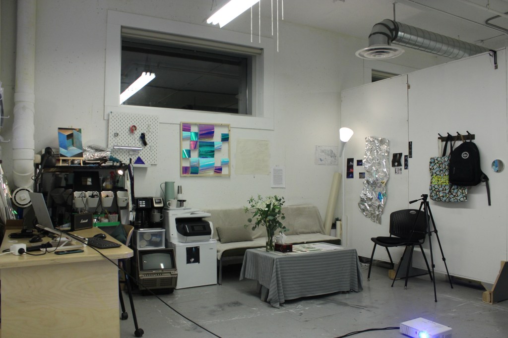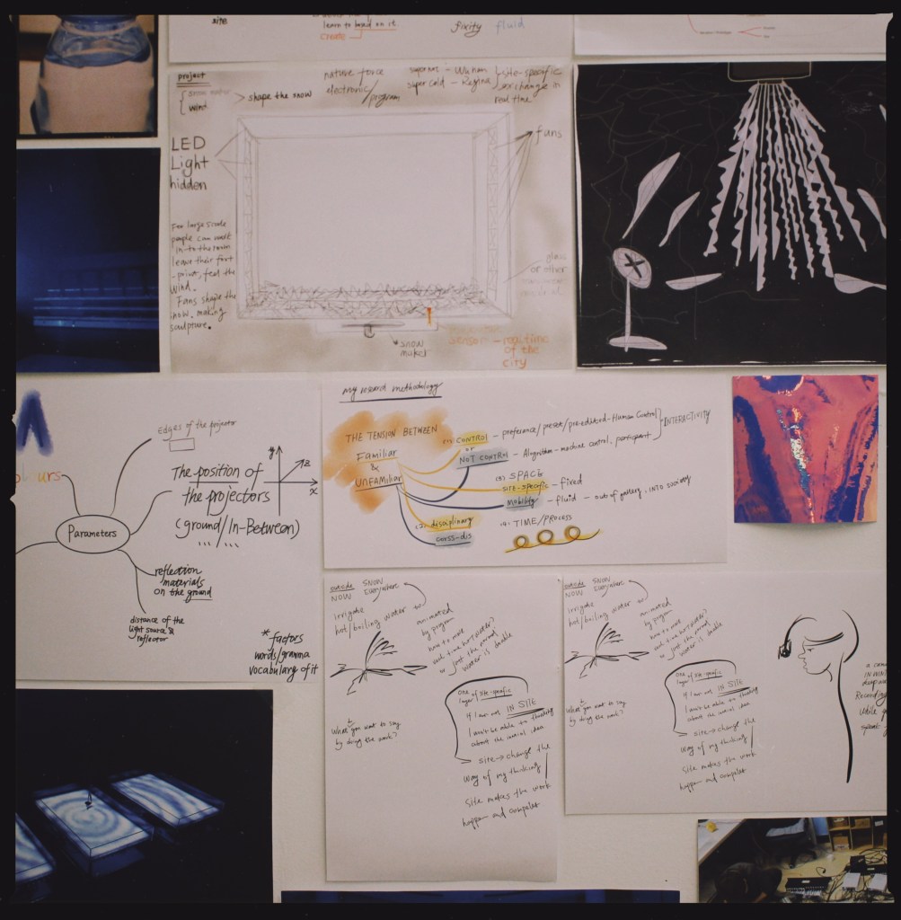 I ended up of using a projector to show the video of “Unsettling Light” on the outside walls of my own studio space – which is the hallway of our sharing studio; a wall of printed images to show my process of making, evidence of researching; computer screens initially was planned to show generative graphic programs made in TouchDesigner, but in the end showed my website and five videos of prototypes of a work.