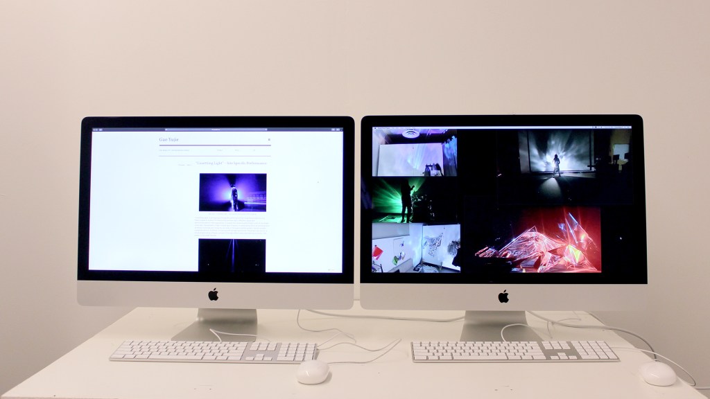 Since I started my program in here, I took the theory and methodology courses, which gave me chances to relocate and redirect my own practice. I made the work Unsettling Light, earlier this year, for the first time, without any experience in professional in dance and body movement, I brought my own body into the work, explored different qualities of light in a theatre space. This work was started in last year when I did the Flow Theory test drive in FA800. Some of the working process can be seen at the right Mac computer. Even this work involved myself as part of the work, but when I was creating it, I had no clue of what performance art is, and I was not sure that performance art would be a new dimension for my practice. However, my path has really been shaped in this semester. In the two-day workshop “Considering Time in Performance Art” with Marilyn Armes, I found the missing piece in my practice, this workshop enabled me see the potential of deep engagement in work through time. There was a moment in that workshop I think I should bring more performance to my work.