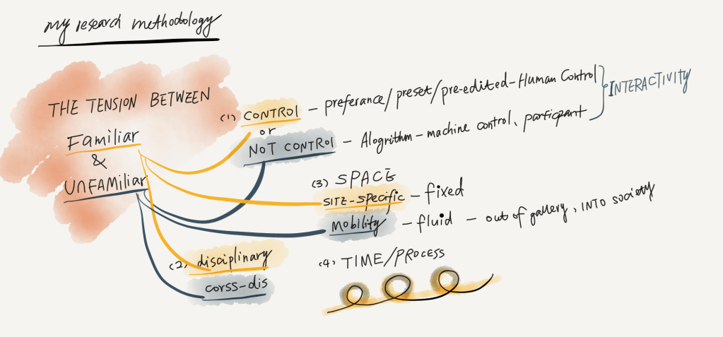 I argue that I am using a methodology based on the tension between the familiar and the unfamiliar. Currently, this is appearing in my research as an investigation of Csikszentmihalyi’s idea of “Flow”[1] as the familiar and Heidegger’s concept of “Angst”[2] as the unfamiliar. This also plays out in the experience of the artworks I make, which aim to create an interactive experience where audiences also move between familiar and unfamiliar. I employ a practice-based research methodology, which is best aligned with Marlene MacCallum’s idea of “research-creation as linear-yet-circular and ongoing process.”[3] For me, this ongoing process is during the creation stage, I work back and forth between familiar and unfamiliar. I argue that as a practice-based researcher, I have the privilege to articulate where my work and research comes from, the ideas of the work does not come from anywhere/nowhere, it is grounded in specific choices, research and methods. At the same time, I think it is important to acknowledge that there are unspoken/unwritten qualities in my work, including embodied experiences, emotions, visual perception and the unknown quality of participants interacting with the work. That is the reason why – my final present of the program must be an exhibition rather than a thesis. The only way to receive the message from the work is to experience them.